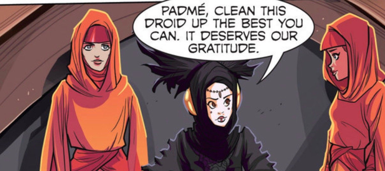 Here’s Sabé, again dressed as the Queen’s decoy, in the Prequel Trilogy Graphic Novel (which is overall quite lovely if you haven’t seen it).