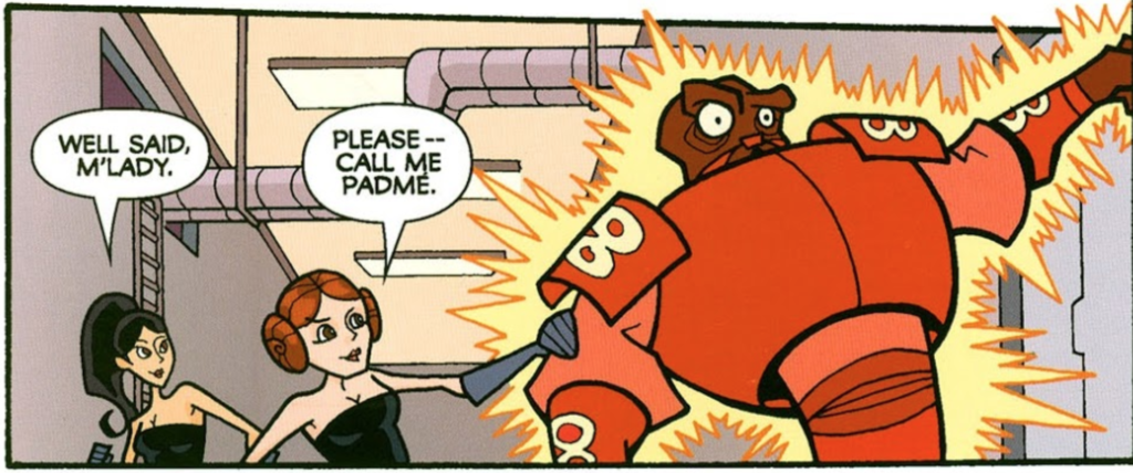 There’s a bit more Padmé to find in Legends materials. There are young reader books told from Padmé’s point of view (A Queen’s Diary) and books that look at her relationship with her handmaidens (Queen in Disguise). Padmé is mentioned or makes appearances in various novels, video games, and comics, but there are not a lot of Padmé specific stories out there (like a comic series about Padmé and her handmaidens – hint, hint Marvel!). My favorite Legends Padmé story I have run across is “Spy Girls” from Clone Wars Adventures Vol. 7 which I also mentioned in my post for Sheltay Retrac.