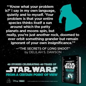 You have written a few short stories for Star Wars that gave backstories for different characters – Pilot Greer Sonnel who appeared in the novel Bloodline in “Scorched”, mercenary Bazine Netal from The Force Awakens in “The Perfect Weapon”, and Imperial spy Garindan ezz Zavor from A New Hope in “The Secrets of Long Snoot.” I’m curious for “Scorched” and “The Perfect Weapon” how much you knew about the characters before you wrote these stories and for “The Secrets of Long Snoot” did you have any guidelines for what you could or could not do for this character?