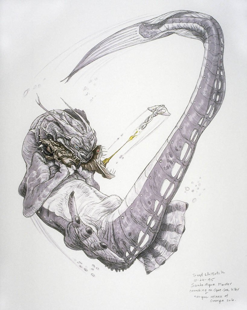 I think the one I did of the Sando Aqua Monster grabbing the Opee Sea Killer in a sort of a somersault pose is one of my favorites (you can see it in The Art of Star Wars–The Phantom Menace). The rest are sort of blurrs, there were so many. [You can find the image below and other concept art from The Phantom Menace in this article about designing monsters from StarWars.com.]