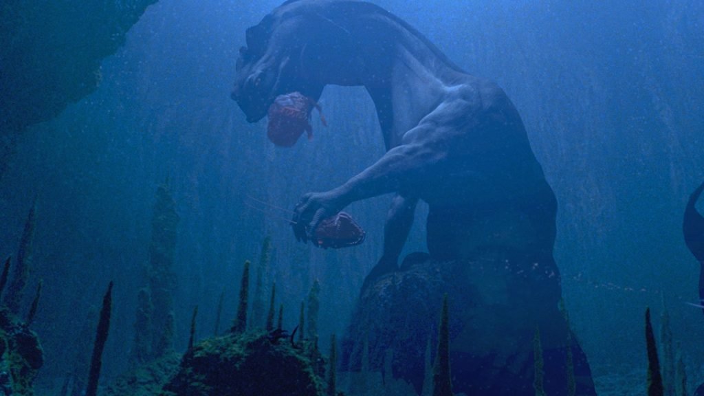 For example, the Sando Aqua Monster was inspired by deep sea angler fish and dragonfish, otters, and tigers, and has an anatomy similar (but not exactly the same) to that of an otter, and skin textures and bioluminescence similar (but likewise not exactly the same) as those deep sea fishes. The personality and crafty way of moving is all tiger. I’d say, the Sando Aqua Monster is a giant underwater tiger for all intents and purposes. That’s the animal I has foremost in mind when I designed her. I had recently seen the terrifying tiger scene from the film Apocalypse Now, and it stayed with me, transformed into the Sando Aqua Monster. Doug Chiang also contributed–originally, the eyes were significantly larger–he made them smaller, which heightened the feeling of a truly massive animal.
