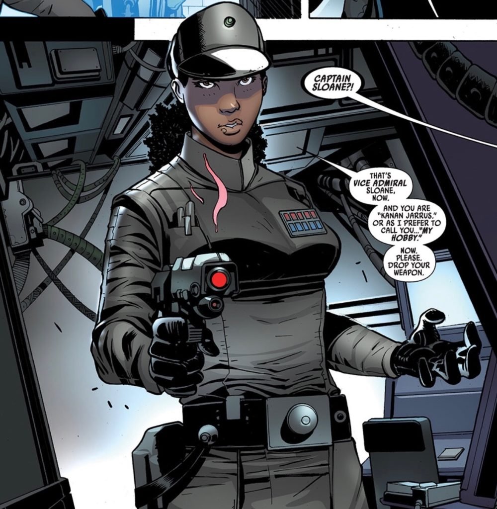 Rae Sloane was an Imperial officer who rose through the ranks of the Imperial Navy eventually becoming a Grand Admiral. She debuted in the novel A New Dawn, which took place between Revenge of the Sith and Star Wars Rebels. Sloane also appeared in all three Aftermath books that took place between Return of the Jedi and The Force Awakens.