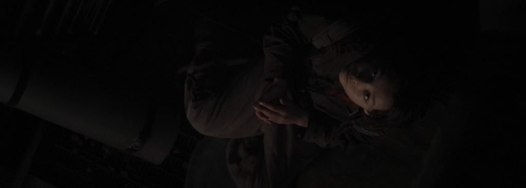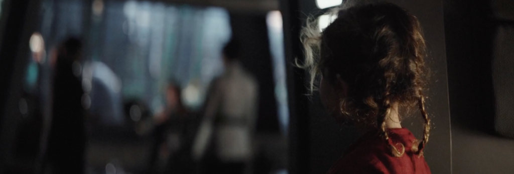 And younger Jyn looking in the direction of her parents Galen and Lyra Erso in a flashback scene during the time Galen was working with Orson Krennic.