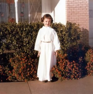 I was five-and-a-half years old in the summer of 1977. I had never seen a “grown up” film in the theater, but I was already a great fan of the original Star Trek, which was running in syndication. As the buzz around Star Wars built, I lobbied and campaigned for the chance to see it. Eventually my parents took me – not once but six times! Watching the film marked a turning point for me. That autumn I went to kindergarten wearing Leia buns and Chewbacca knee socks. My parents were (and are) wonderful about encouraging my enthusiasm: books, action figures, inflatable lightsabers, costumes, you name it. We did (and do) quote the films to each other. Star Wars has informed every stage of my life, and it continues to be a common language that all of the members of my family members speak with tremendous affection.
