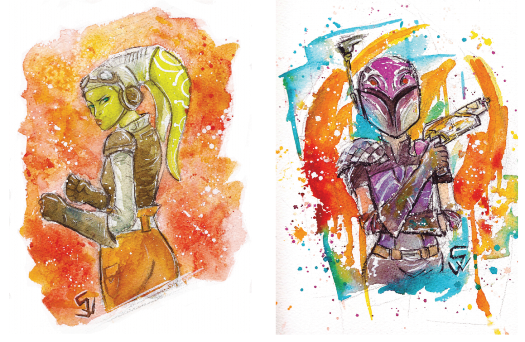 Characters were assigned to us. I’m still super stoked and honored to draw all the characters I was given- they are my favs and were a blast to work on. I was familiar with pretty much all of them, though I got to learn more about each of them. I was so happy to have the privilege to draw Sabine again- that was a really exciting moment. Another example, I had seen Enfys Nest in the Solo trailer, but at the time I was drawing her, it was a spoiler that she was a woman so it was really cool to get to see her references and draw her in a powerful pose.