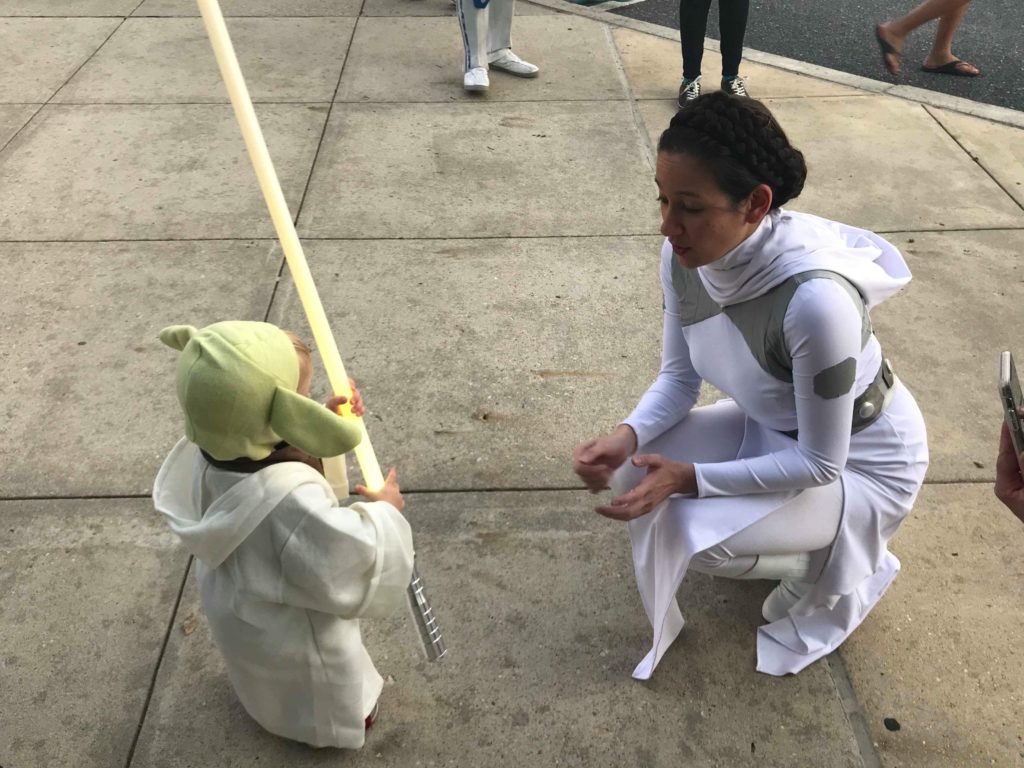 We met this one girl who I think was maybe 11 or 12 years old and she was a huuuuuge Star Wars fan and had this big grin on her face as soon as she saw us. One of my basemates had 3D printed Han Solo dice and put them on gold chains just like in the movie so we could give them out. This girl and I were chatting and at one point, I told her to hold out her hand and pressed the dice into them and told her that they belonged to my husband Han and they’d brought him a lot of luck in the past and that I wanted to give them and the luck to her. The expression on her face made it hard not to tear up until after we’d left her room and one of our stormtroopers immediately gave me a hug. I love just about everything about getting to be a Star War on the weekends but having meaningful interactions like these make it all worth it.