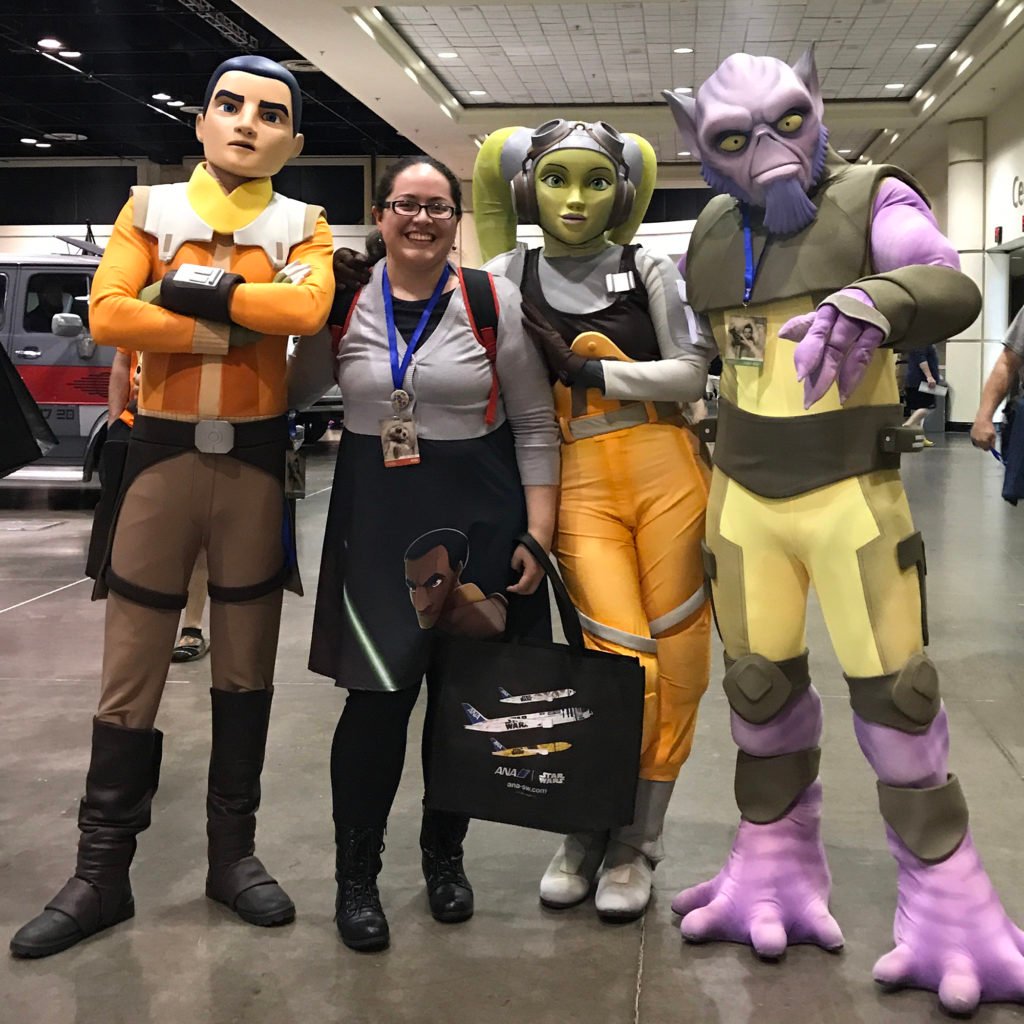 When it comes to Star Wars content, Star Wars Celebration is my absolute favorite because I know I’ll be able to find panels, merchandise, and cosplays pertaining to the animated shows. San Diego Comic-Con and New York Comic Con come next in my list of favorite conventions, but there isn’t a big Star Wars animation presence at either con. In situations like that, I tend to go around Artist Alley and see what character art I can find as well as any artists who might have worked on a project close to the animated shows. For example, at this year’s NYCC, I found Pepe Larraz (Star Wars: Kanan) in Artist Alley and asked to interview him. So if you’re ever at a con where the Lucasfilm presence is small or missing, find other connections and make the most of them.