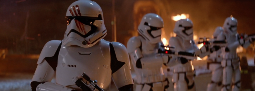 The shot that precedes Kylo’s very first shot in The Force Awakens is a wide shot of a group of First Order troopers in a Jakku village. On the left with the bloodstain on his helmet is FN-2187, later referred to as Finn, looking in the direction of Kylo’s shuttle.