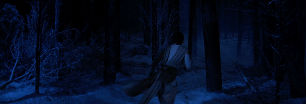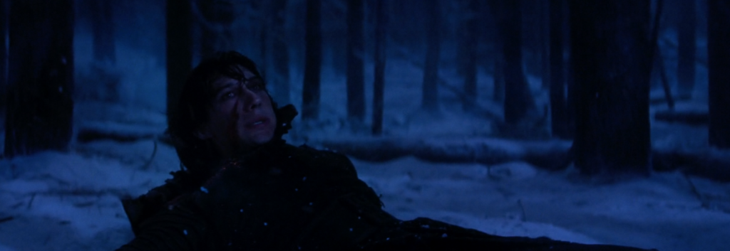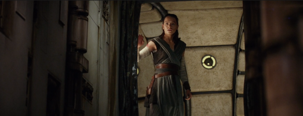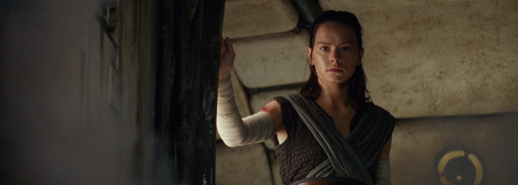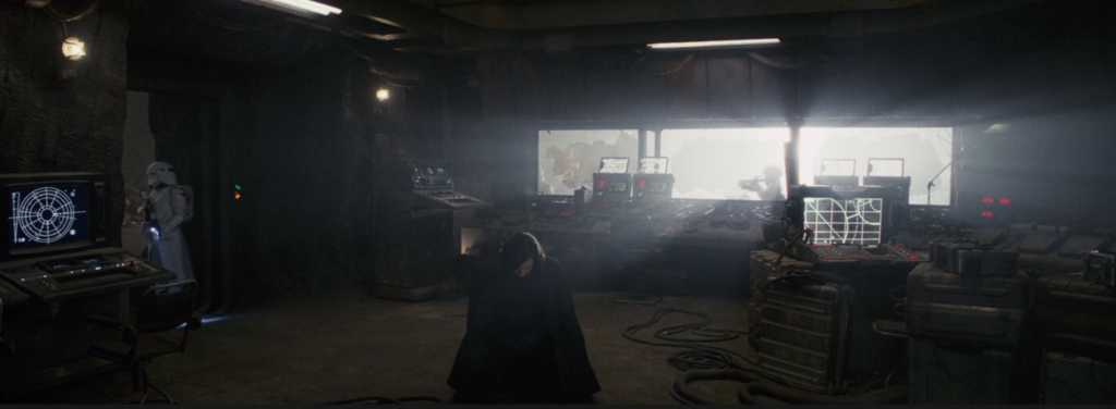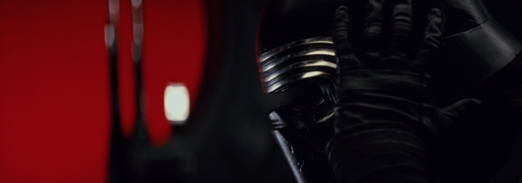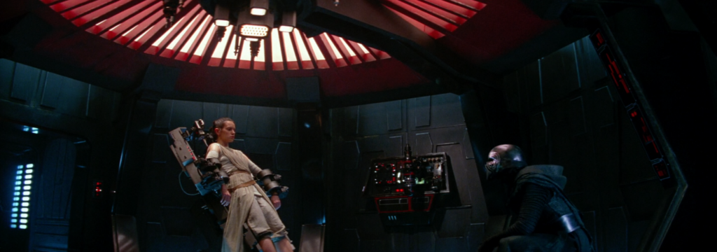 The last shot of Kylo somewhat mirrors the shot up above of Rey strapped to the table. Again we have a wide shot with Rey and Kylo on opposite sides of the screen. But this time, Rey is the one in full control.