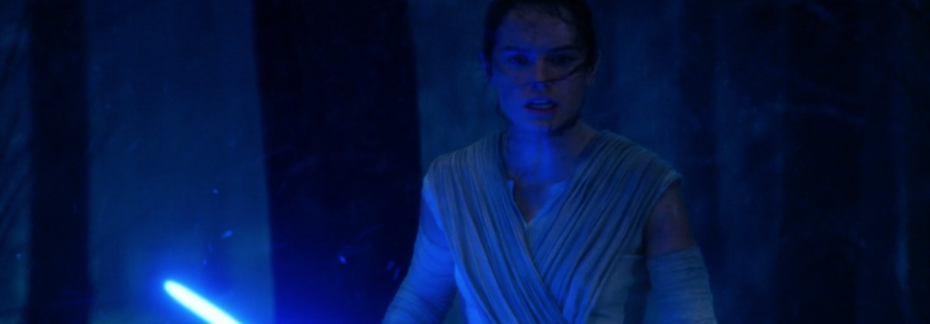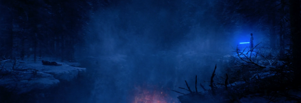 Shots of Rey similarly surround the last shots of Kylo in The Force Awakens. After their lightsaber battle in the woods, Rey has once again bested Kylo. Shortly after Rey knocks Kylo down seriously wounding him, the instability of Starkiller Base creates a chasm that divides them. In the screenshot below Kylo is on the left while Rey, with a lightsaber, is on the right.