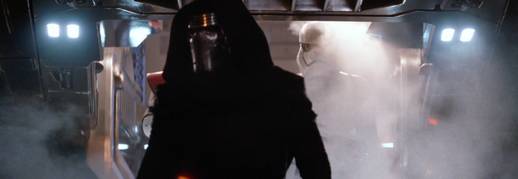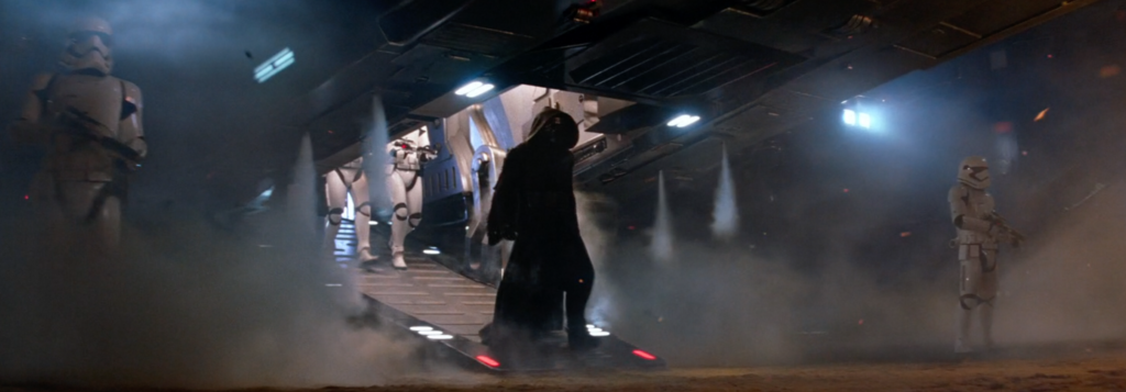 I talked a lot about Kylo’s introduction in The Force Awakens in this article for the official Star Wars site. One of the things I mentioned is how the shot of Kylo walking down a ship ramp with smoke blowing out of the exhaust pipes is reminiscent of shots of Darth Vader and Emperor Palpatine exiting ships in the Original Trilogy.