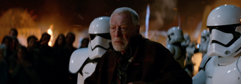 A closer shot of Kylo then cuts to a shot of Lor San Tekka held by First Order troopers. Kylo is after one thing, the map to Luke Skywalker, and he’s ready and willing to destroy anything and anyone in his way to get it.