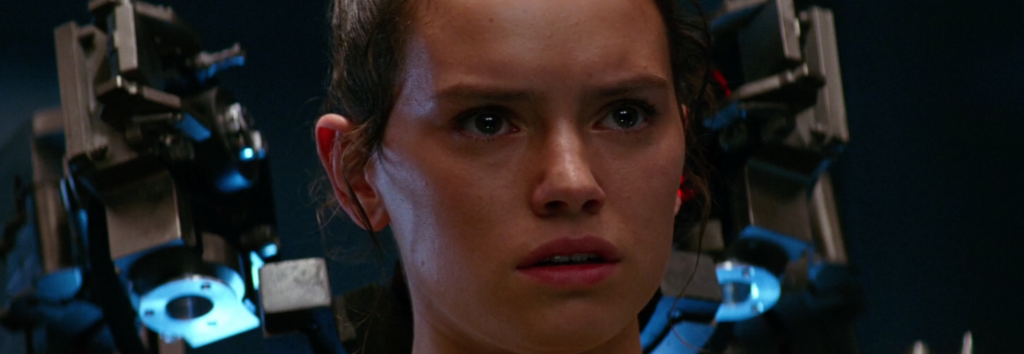 Right before Kylo takes off his mask there is a wide shot of Rey strapped to the same chair Kylo used to rip information from Poe Dameron’s mind earlier in the film. Rey is in a near standing position with Kylo kneeling in front of her. This is a somewhat submissive stance for Kylo, but since Rey is restrained he still has all of the control and power in this scene.