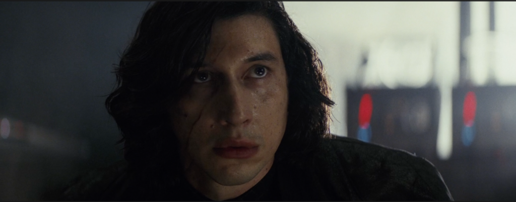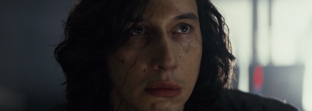 In both his first and last shots (where he is unmasked) in The Last Jedi Kylo is on his knees looking to the floor – but in completely different circumstances. In the beginning of the film Kylo is trying to please and prove himself once again to Snoke. At the end, he appears both enraged and saddened by Rey’s rejection.