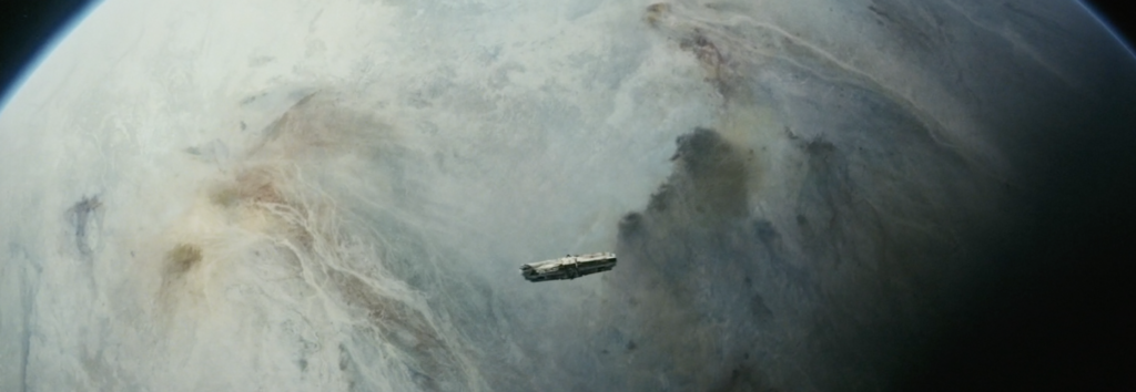 This shot transitions into a shot of the Millenium Falcon and the surviving members of the Resistance leaving