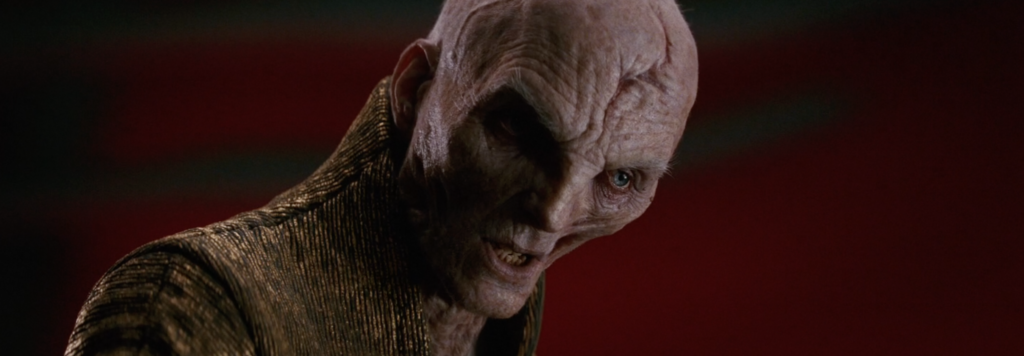 Unlike his unmasking scene in The Force Awakens where he feels in control, in this scene Kylo is dominated by Snoke who towers over him as Kylo looks at the floor. Before this scene ends, Snoke refers to Kylo as a child in a mask echoing a bit Rey’s creature in a mask line from The Force Awakens.