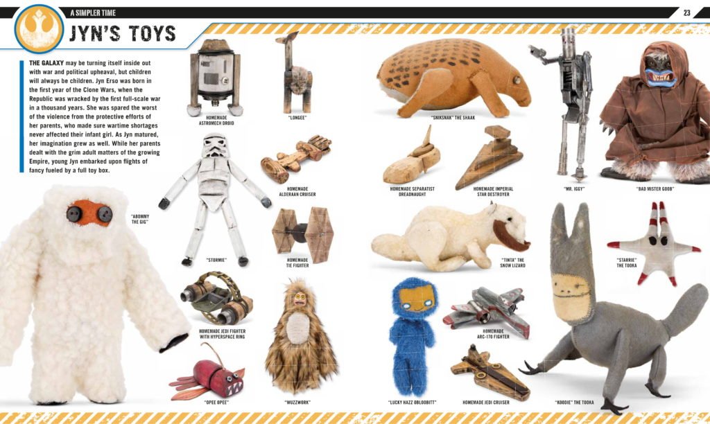 I’m so glad you’ve mentioned this page! This and the cute page on Jyn’s childhood toys were late additions to the book, necessitated by not being able to get other material in time for our print dates. But we were so glad we added these pages as they offer exclusive information that we know the fans love to see and don’t get anywhere else. We relied on Story Group maestro Pablo for the names and the easter eggs, but there are a few inventions of our own in there!