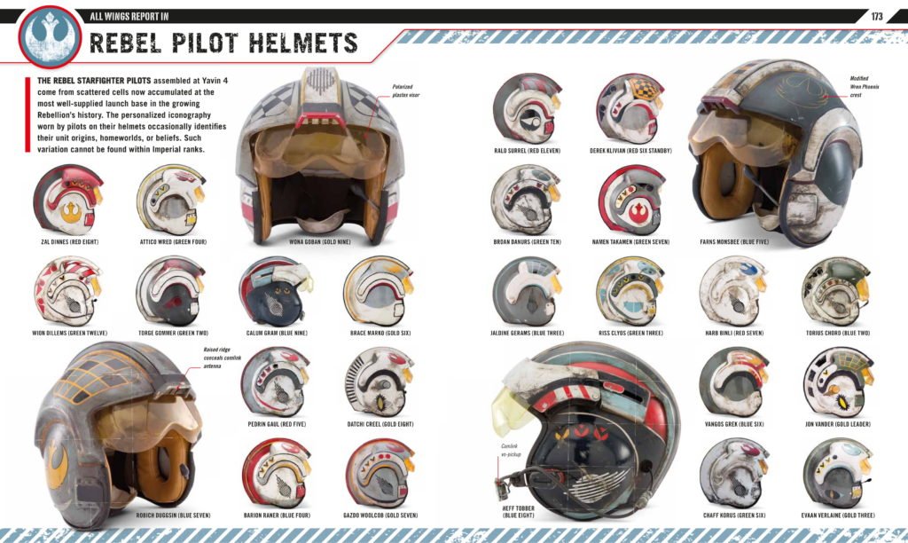 One of my favorite spreads in the Rogue One Visual Guide is of the rebel pilot helmets. Who came up with the names for all of the pilots that we either never heard referred to by name in the film or we may not have seen? I’m also curious who decided to include a helmet for Evaan Verlaine – who wasn’t seen in the film but is a character introduced in a Princess Leia comic series. That was such a nice touch.