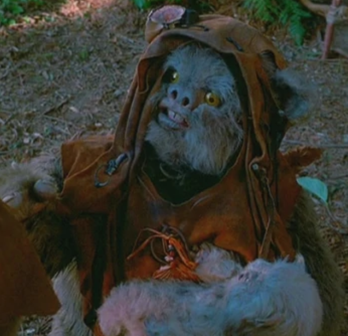 Winda’s first Star Wars appearance was in the 1984 TV movie Caravan of Courage: An Ewok Adventure. In the screenshot below baby Winda is being held by her mother Shodu Warrick (look for her post soon).