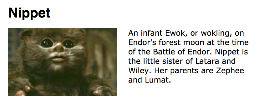 Do you remember the tiny baby Ewok who startled during C-3PO’s impression of Darth Vader in Return of the Jedi? Then you remember Nippet. Nippet was named for the first time in the novel Return of the Jedi: Beware the Power of the Dark Side!