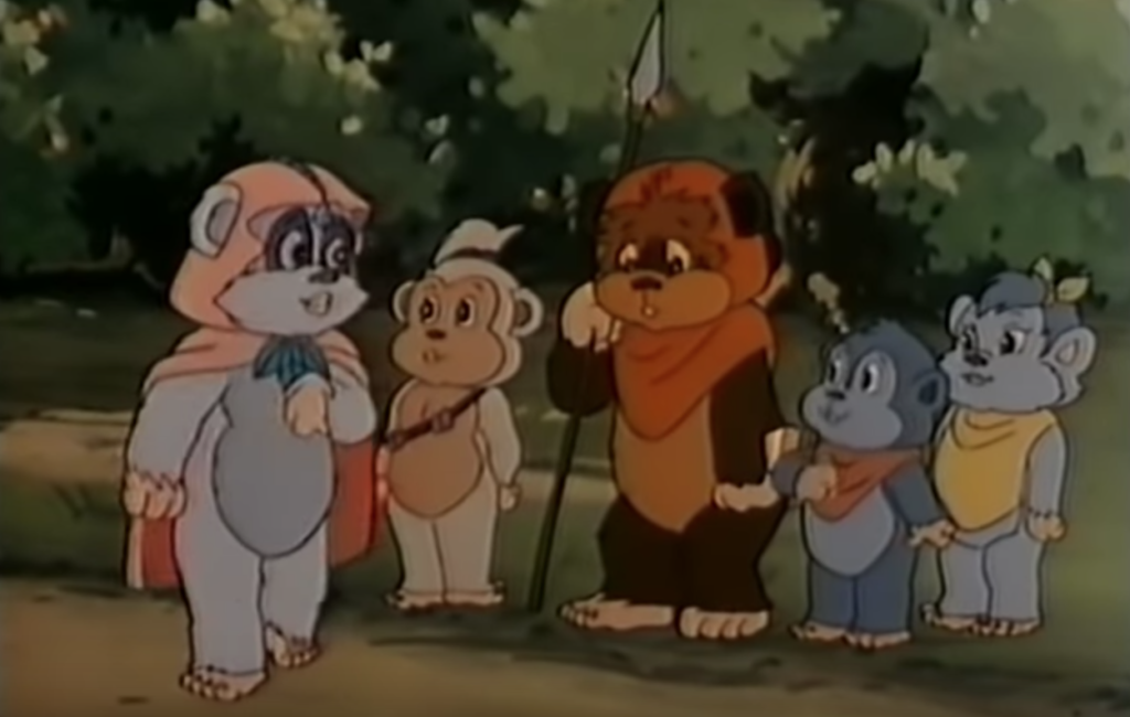 Since the Ewok TV series was supposed to have occurred before the Battle of Endor which takes place in Return of the Jedi it doesn’t make much sense that Nippet looks older in the series than she does in the film. But she’s identified as Nippet a few minutes into this episode of Star Wars: Ewoks called “The Travelling Jindas.”