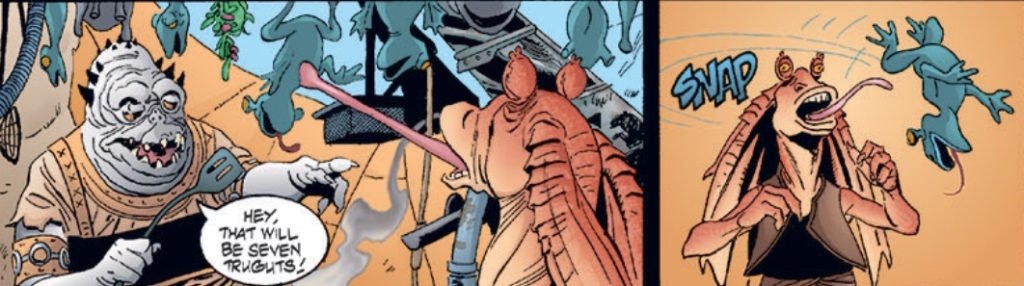Gragra worked in a Mos Espa marketplace in The Phantom Menace. Gragra gave Jar Jar Binks a hard time for eating something he didn’t pay for.