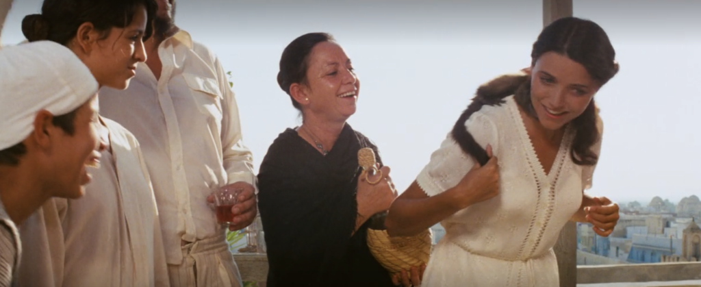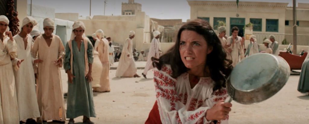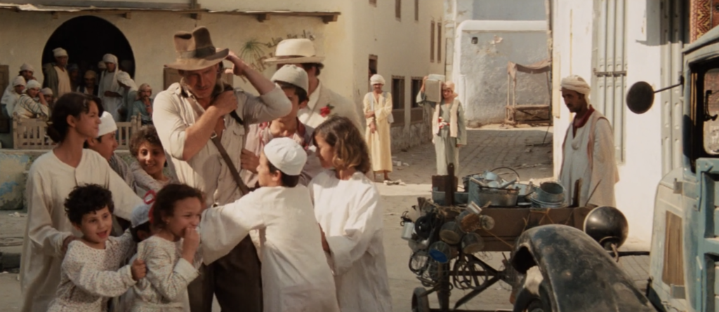 In the next sequence, Marion is abducted, but not before she puts up a good fight (although she does yell “Indy!!! Indyyyyyyy!!!!” a few too many times for my taste). There are two interesting things of note in this sequence to me. #1 When Marion gets to pick her own clothes they make sense for her location – a white cotton dress and a loose-fitting pants and top outfit. #2 There are zero women in the streets or cafes in this village but hundreds of men. This happens a lot in films and I always think it’s odd.