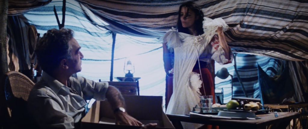 The next sequence takes place in the various Cairo dig sites. It’s not surprising that these scenes are men-only until we catch up with Marion again. Indy finds Marion tied up but since he doesn’t want to tip off anyone that he’s there he decides to leave her there. The man who has tied up Marion is no stranger to Indy – it’s his rival Belloq. Belloq is clearly quite smitten with Marion and somehow comes up with a dress and shoes that are just her size. Marion toys with Belloq in this scene with some wonderful “I’ll put on your silly white gown while hiding a knife under this napkin” energy.