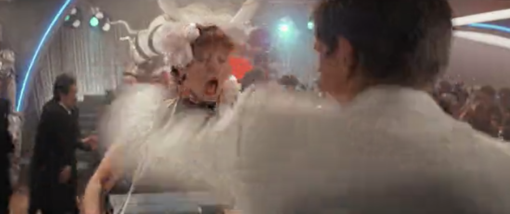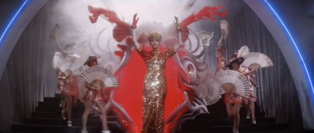 This realistic dancing scene is then followed by an elaborate (not realistic, but delightful) Busby Berkeley style dance number. Associate Producer Kathleen Kennedy is in there somewhere on the dance floor (I’d like to think in the screenshot below).