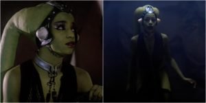 Rystáll Sant debuted in the Special Edition of Return of the Jedi where she performed as a backup dancer in Jabba’s Palace. Discover more aboutRystáll Sant here.